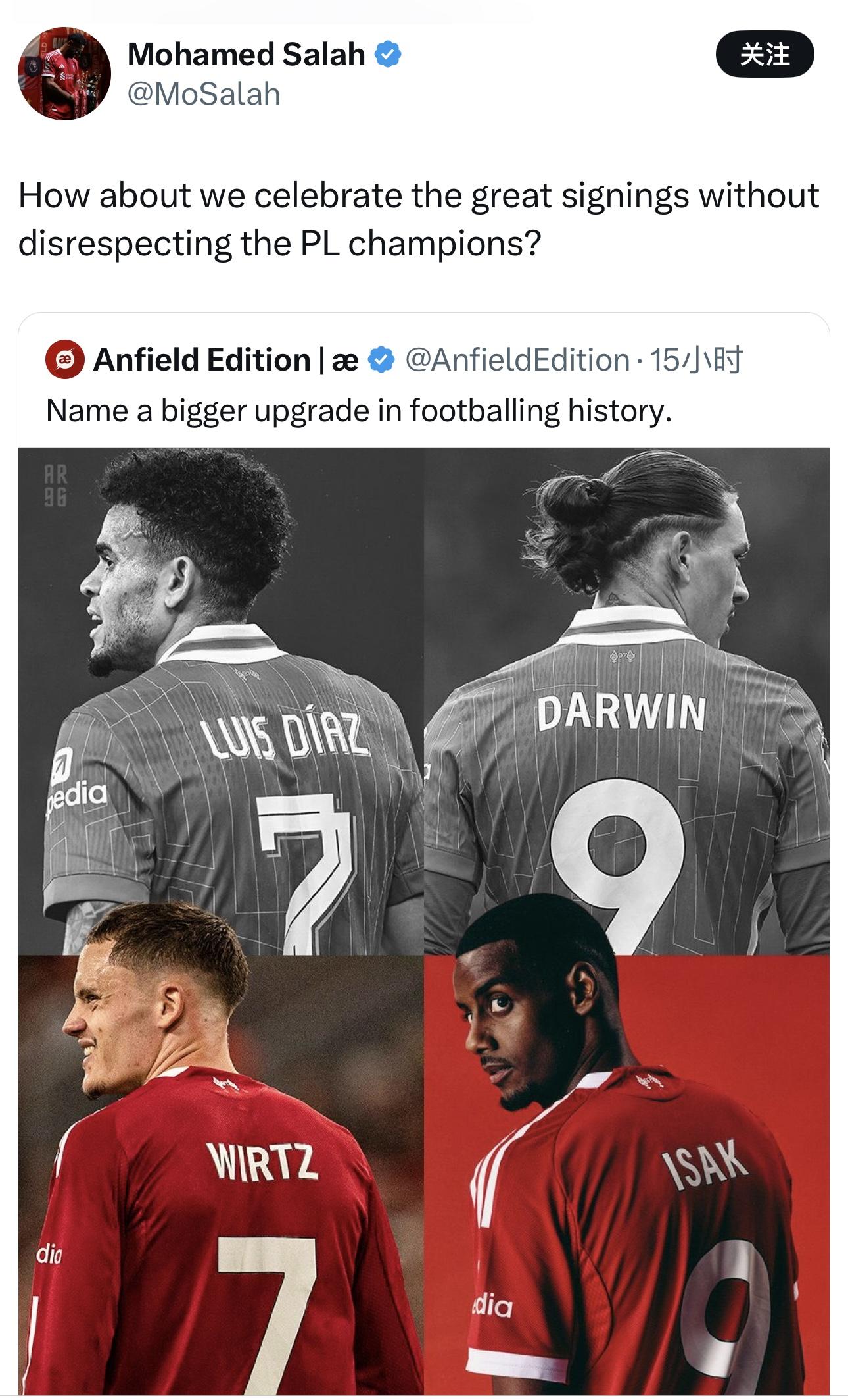 据悉,一利物浦球迷在社媒上转发了利物浦队今夏签下的两位新援维尔茨和伊萨克顶替离队的迪亚斯和努涅斯照片,并配文表示:“请说出一个在足球史上更好的升级签约。”